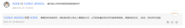 1月24日,有投资者在投资者互动平台上提问:“公司有考虑收购美国微软吗?”对此,九安医疗回复称:“微软是世界上受人尊敬的公司,目前九安医疗的体量没有任何可能收购微软。”