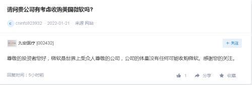 值得注意的是,还有投资者提问“请问贵公司有考虑收购美国微软吗?”,公司回答“微软是世界上受众人尊敬的公司,公司的体量没有任何可能收购微软。感谢您的关注。”