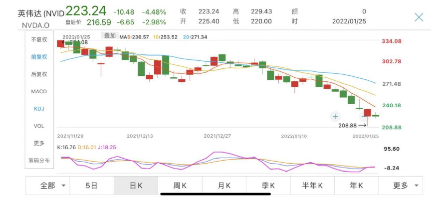 英伟达收跌4.48%,报223.24美元,总市值5581亿美元,今年开年以来已收跌23%。