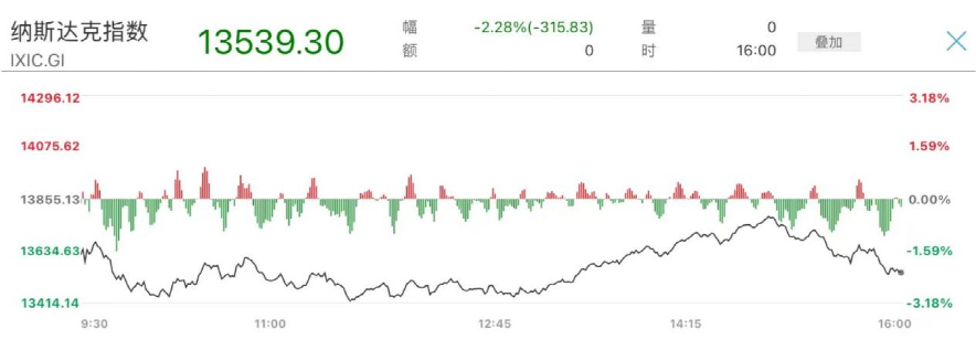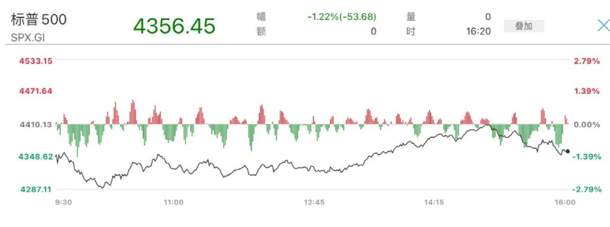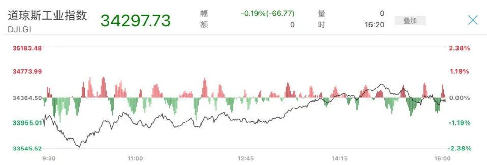 道指和标普500指数险些连续两天大逆转,但最终齐收跌。道指收跌66.77点,报34297.73点,跌0.2%,盘中一度跌约2.4%;纳指收跌315.83点,报13539.29点,跌2.28%,盘中一度跌约3.2%;标普500指数收跌53.68点,报4356.45点,跌1.22%,盘中一度跌约3.2%。