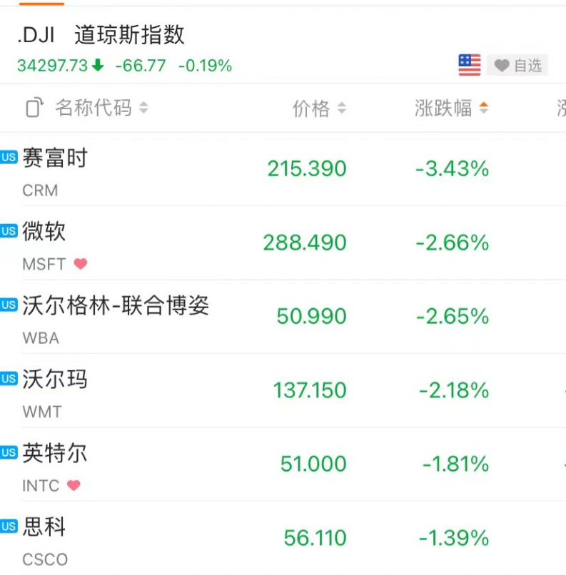 道指成分股方面,赛富时跌3.43%,微软跌2.66%领跌,WBA跌2.65%,沃尔玛跌2.18%,英特尔跌1.81%。
