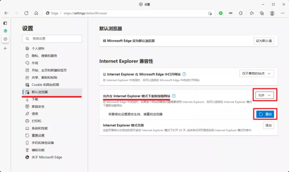 打开 Edge 的设置,找到默认浏览器 这一栏,允许在 Internet Explorer 模式下重新加载网站 改为 允许 ,记得点击下面的 重启 。