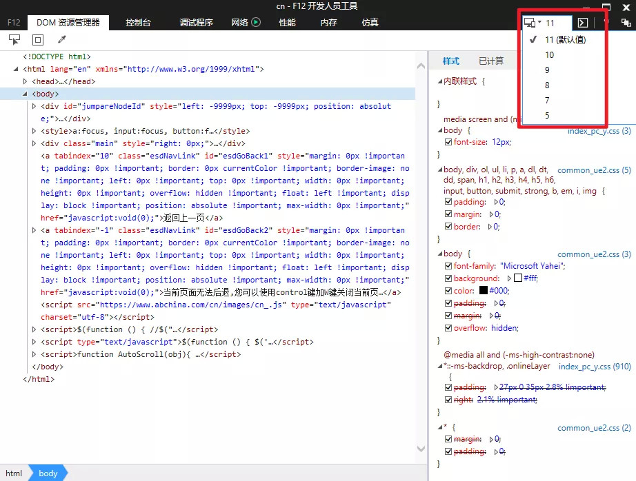 右上角可以修改你需要的 IE 版本,不过注意关闭这个界面会使 IE 版本重置为默认值哦。