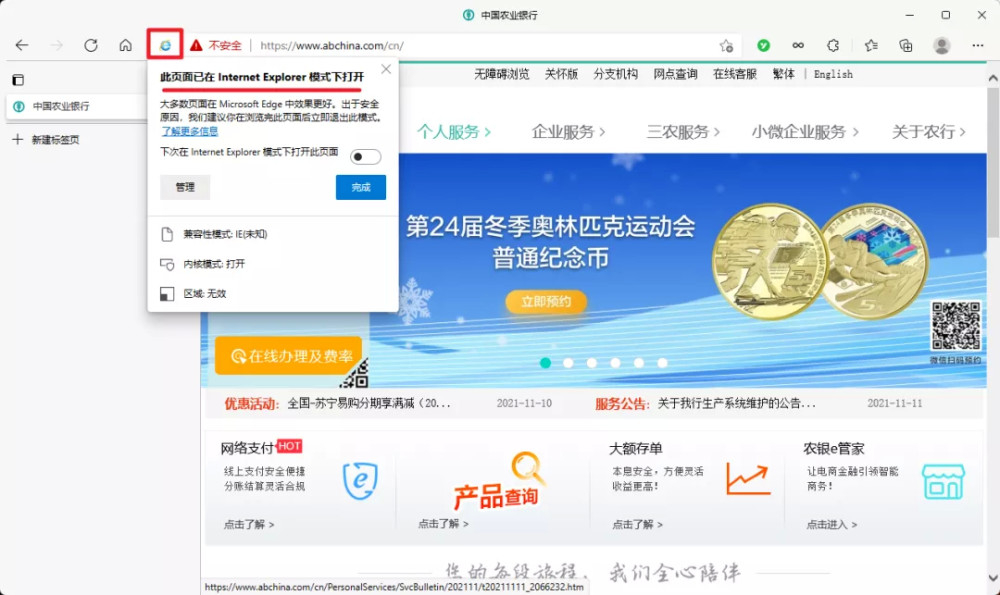 重新加载后,地址栏前方就会出现 IE 的小图标,并提示现在处于 IE 模式。