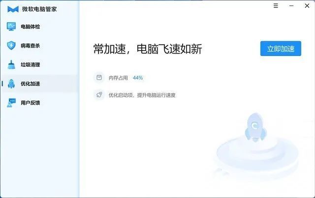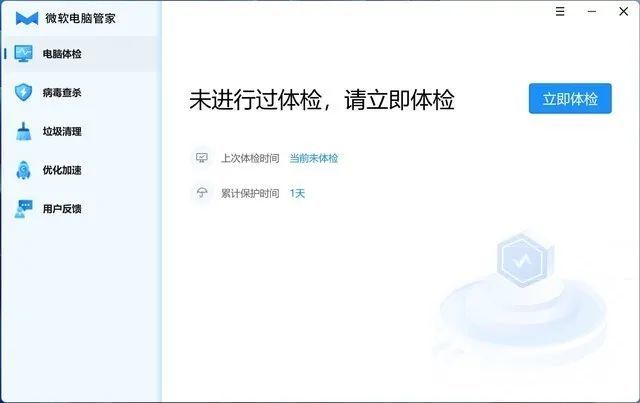 在应用主界面我们可以看到整体的UI风格非常简单,有电脑体检、病毒查杀、垃圾清理、优化加速、用户反馈几个基础的管家功能。