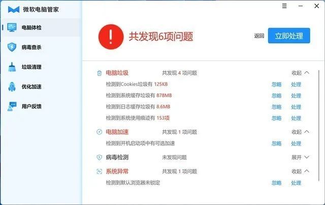 电脑体检这里大概有电脑垃圾清理、电脑加速、病毒检测和系统异常检测这么几个功能模块,与我们常用的一些电脑管家应用在功能上别无二致。