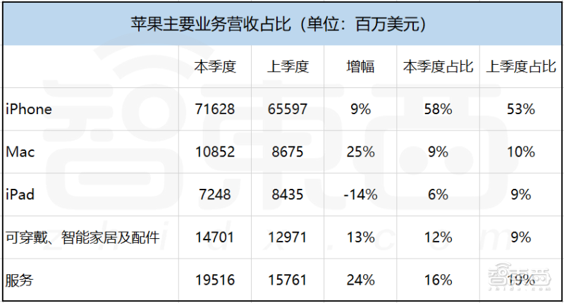 在另外几项业务中,Mac电脑的季度营收同比增长达到了25%,是增幅最高的业务,库克和苹果CFO卢卡 马埃斯特里(Luca Maestri)都在财报电话会议中强调了自研M1系列芯片在Mac电脑中的应用起到了关键作用。