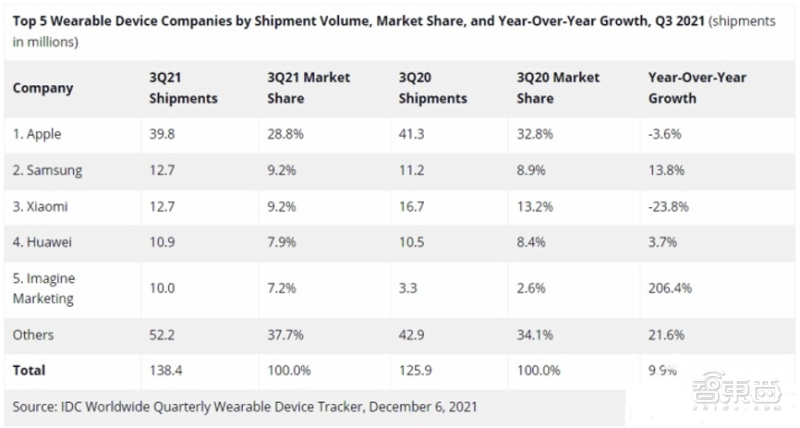 ▲2021年第三季度全球可穿戴市场出货量,来源:IDC