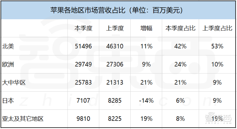 这次大中华区营收达到了257亿美元,同比增长达到了21%,是所有市场中增速最高的,并且营收占比从上季度的9%直接跃升至21%。