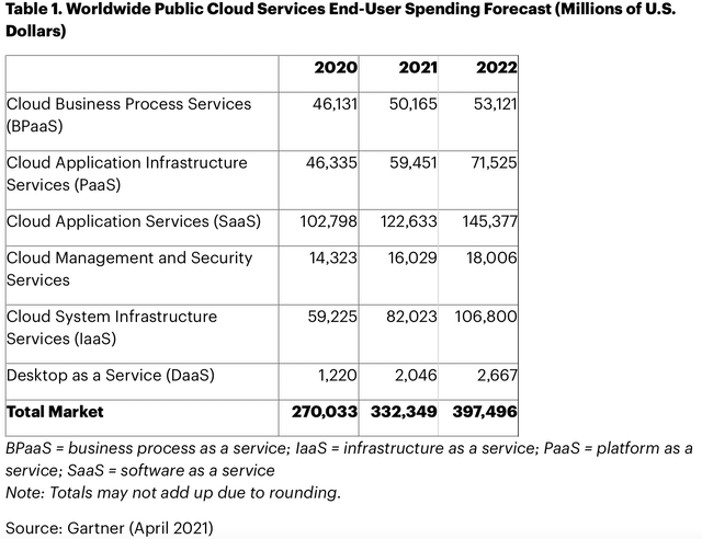 全球公共云服务最终用户支出预测(来源:gartner.com)
