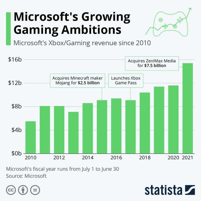此次收购凸显了该公司进军游戏市场的雄心壮志。自2001年推出Xbox以来,在过去的20年里,它在游戏领域的市场份额一直在增长。此外,自2015年收购Minecraft的创造者Mojang以来,该公司一直积极扩大其游戏业务。随后于2017年推出Xbox Game Pass,并于去年收购了Bethesda Game Studios的母公司 ZeniMax Media。