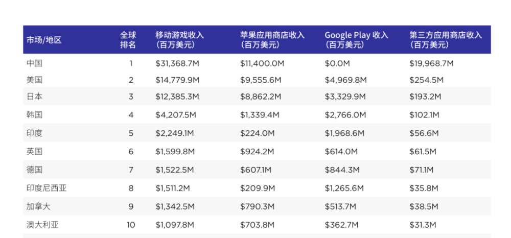 同时报告显示:全球移动游戏市场总收入为907亿美元仅计算消费者所带来的游戏收入,不包括广告收入。其中,45.3%(411亿美元)将由苹果应用商店贡献。Google Play将贡献全球移动游戏总收入的31.1%(282亿美元),第三方应用商店将贡献其余的23.5%(213亿美元)。