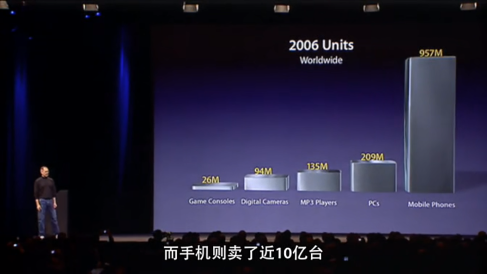 那一次发布会的末尾,乔布斯公布了这么一组数据。2006年,世界范围内,游戏机卖了2600万台,数码相机卖了9400万台,MP3播放器卖了1.35亿台,个人电脑2.09亿台,而手机则卖了近10亿台。