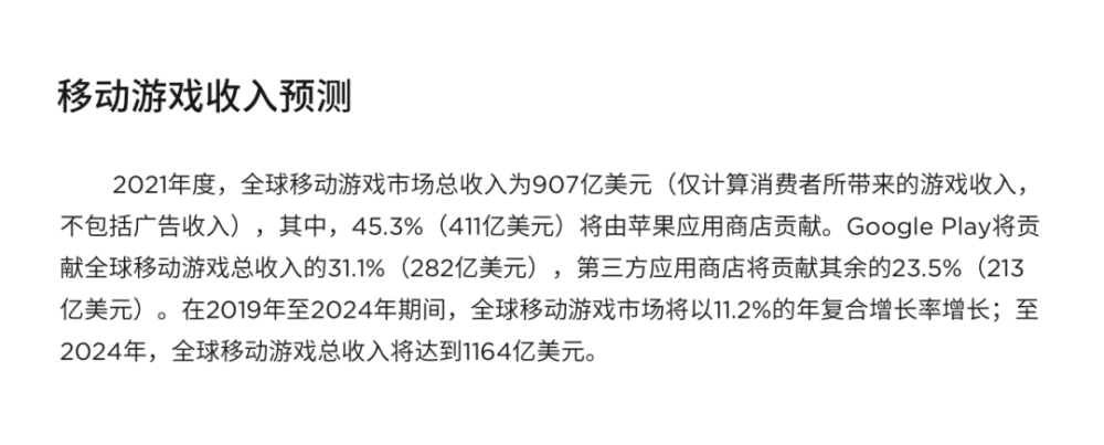 在2019年至2024年期间,全球移动游戏市场将以11.2%的年复合增长率增长;至2024年,全球移动游戏总收入将达到1164亿美元。