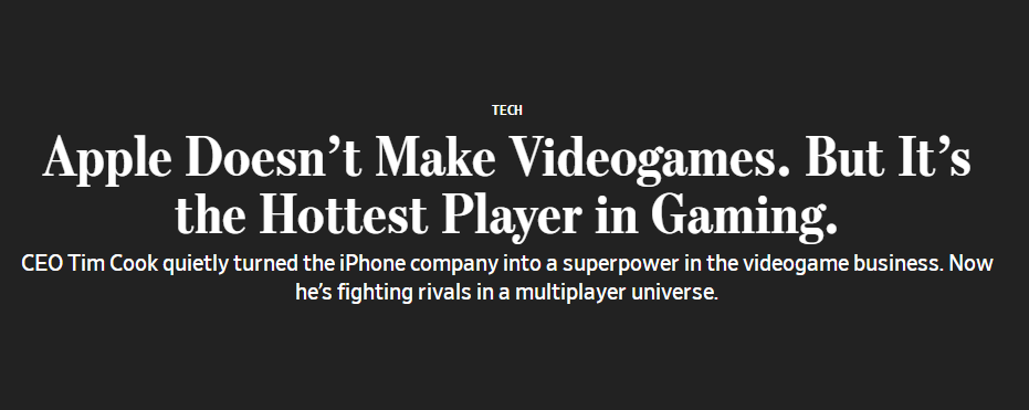 《华尔街日报》还发文称“苹果不做游戏,但确是游戏行业中的头号玩家。”“苹果CEO库克已经悄悄地将苹果公司变成电子游戏行业中的超级力量。”
