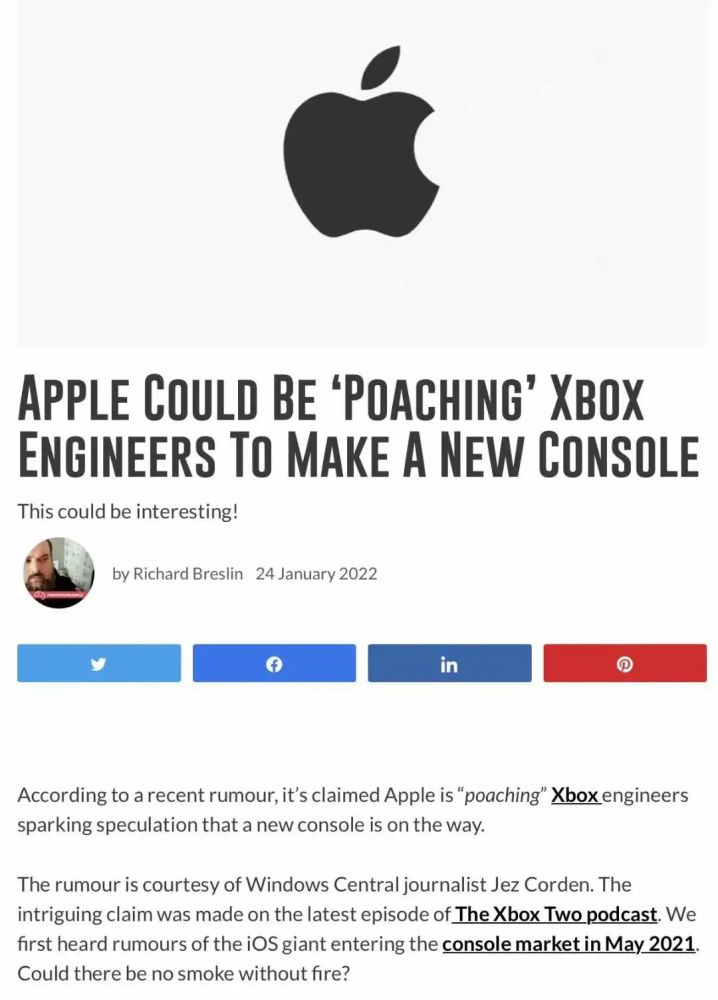 前几日偶然看见一张图,翻译概括为:“有传言,苹果在挖Xbox的工程师做自己的主机。”想要在Xbox和PS两座主机大山之间开拓自己的主机市场,同时还要补充主机游戏的内容,唯一成功的恐怕只有任天堂和他的NS。