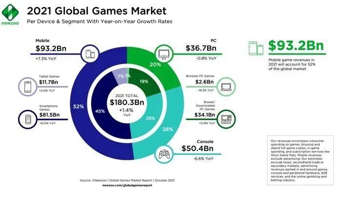 根据Newzoo发布的《2021年全球游戏市场报告》,2021年的游戏市场产生1758亿美元的总收入,移动游戏占有率为52%,游戏主机占有率为28%,PC占有率为20%。