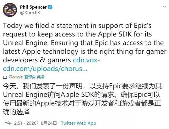 2020年8月24日,微软Xbox负责人,同时也是微软收购动视暴雪的主人公之一,大家近日的玩梗P图对象――菲尔・斯宾塞,发布了一则推特同时附上了法院的证词,代表微软在本次诉讼中站队Epic Games。不过推文中提到的是Epic Games的UE引擎,对于游戏和开发引擎的分成模式又是两种不同的思路了。