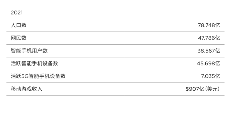 根据NEWZOO与Apptopia联合发布的《全球移动市场报告》显示,2021年全球智能手机用户数达到38.567亿,移动游戏收入为907亿美元。