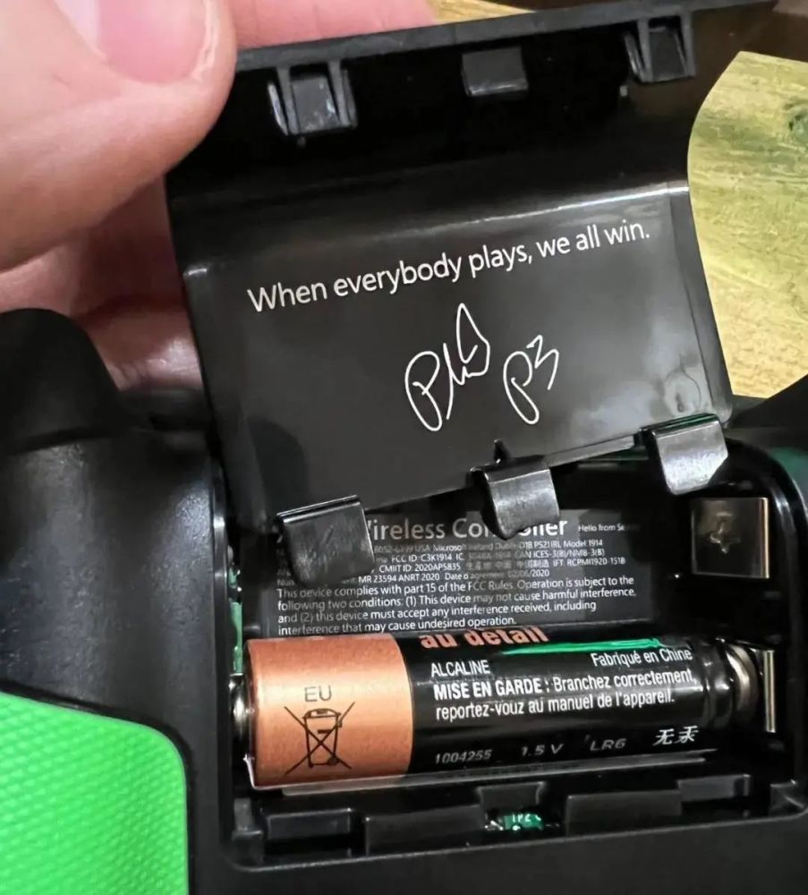 (微软Xbox负责人斯宾塞的手柄电池盖背后写着"When everybody plays, we all win.")