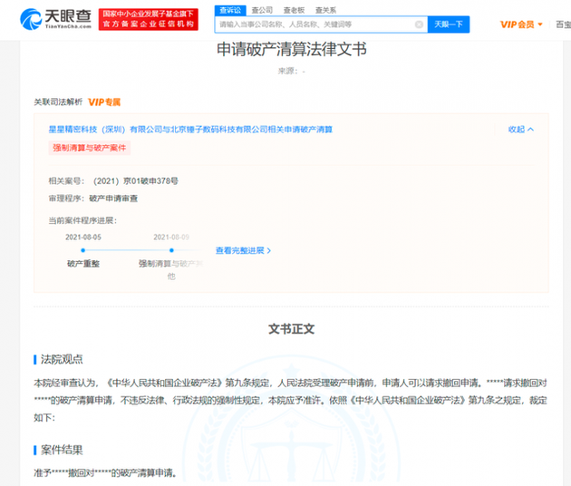 ( 中国经济周刊 )天眼查 App 显示,近日,北京锤子数码科技有限公司新增一则撤回破产清算申请裁定书显示,准予星星精密科技(深圳)有限公司撤回对北京锤子数码科技有限公司的破产清算申请。裁定日期为 2021 年 8 月 9 日。