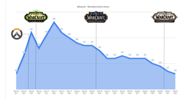 根据Gamerant的资料中可以发现,动视暴雪的月活跃用户从2017第二季达到最高峰后,一路下滑,到2021年中还是如此。其中可以发现,即使在疫情期间,大多数人有更多的时间留在家里打游戏的情况下,活跃用户数却还是无法维持。这其实反应了很多游戏即使很经典,但陆续所推出游戏更新内容,玩家并没有为之买单。