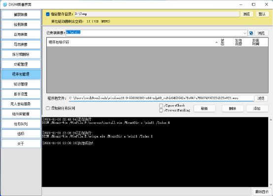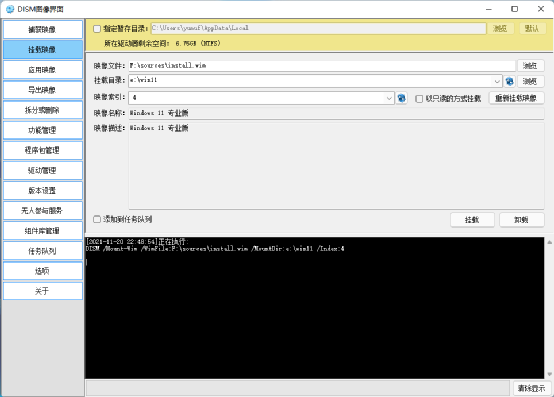 加载镜像:先将Windows 11安装文件(Win11_Chinese(Simplified)_x64.iso)加载到虚拟光驱,接着使用资源管理器打开后将“sourcesInstall.wim”复制到E:备用。然后到https://pan.baidu.com/s/1dDuyh25下载“DismGUI”,启动软件后切换到“挂载映像”,在右侧窗格按提示选择挂载映像文件(即上述提取Install.wim文件)、挂载目录(先自行在NTFS分区创建“E:win11”目录)和映像索引(Windows 11专业版是“4”),然后点击“挂载”,按提示将映像文件挂载到E:win11备用。