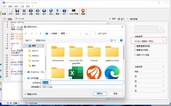下载 “Bat_To_Exe_Converter.exe”,将批处理转化为EXE程序。启动程序后点击“文件/打开”,打开上述保存在桌面的“1.bat”,右侧窗格的EXE格式选择“64位控制台(可见)”,最后点击“转换”,将其保存为“xz.exe”放置在桌面备用(图7)。
