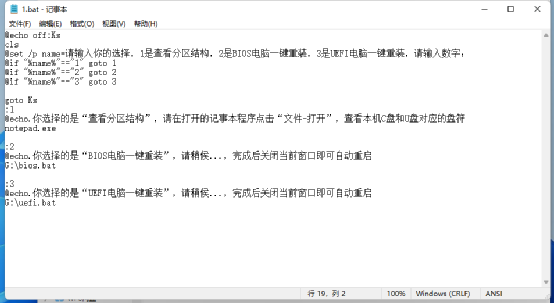 1.bat:进入PE系统自动加载的批处理,这个批处理让用户进行选择,因为BIOS和UEFI电脑代码不同,这里通过用户输入不同的数字执行对应的批处理来完成自动安装。1是启动记事本用于查看分区结构,2、3是分别启动G:下不同的批处理,G:为上述分区的U盘的第二分区,请根据自己实际电脑设置(图5)。