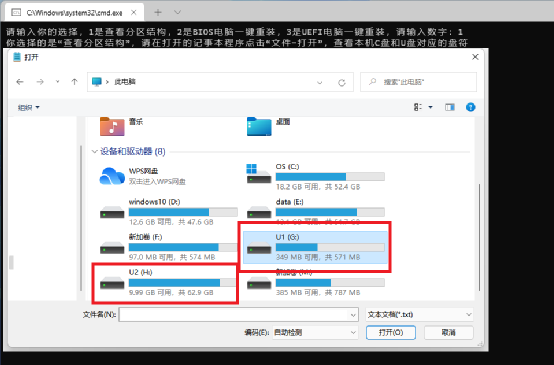 查看分区结构和U盘的盘符:现在将上述制作好的U盘插入电脑,设置U盘为第一启动设备后会自动启动到PE系统,同时在进入系统后会自动运行“xz.exe”。这里为了避免误格式化分区,首次使用建议先输入数字1,回车后打开记事本,可以点击“文件打开”,在浏览窗口可以确定本机的C盘和U盘对应的盘符,比如笔者需要重装系统的分区是C:对应的U盘第一、二分区则为G:H:建议分别将其卷标设置为U1、U2以方便区分。