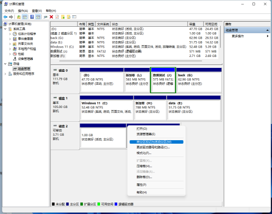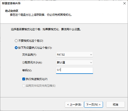 对U盘进行分区:首先准备一个8GB以上的U盘,将其插入到电脑中后右击桌面“此电脑管理磁盘管理”,接着在磁盘管理窗格选中插入的U盘,右击选择“删除卷”,按提示将其分区删除后右击选择“新建简单卷”,按提示新建一个1GB分区,格式使用FAT32格式,然后按提示将其格式化(图1)。