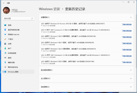 下载离线补丁包:找到任意一部已经安装Windows 11系统的电脑,先将系统更新到最新状态。然后点击“开始设置系统和更新更新历史记录”, 在打开的窗口可以看到目前Windows 11所有已经安装的更新,这里依次记住质量更新的补丁编号,比如KB5006363。