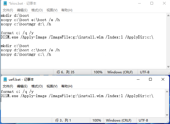 bios.bat和uefi.bat:分别是为不同启动类型的电脑准备的批处理,下载后将其放置在G:(这个为上述分区的U盘的第二分区)。其中前者比后者多了复制文件的代码,它会将C:boot所有文件复制到D:boot,将C:bootmgr复制到D:备份保存,这些是BIOS启动所需的启动文件。对于UEFI启动的电脑,启动文件在隐藏的EFI分区,格式化后仍然存在所以无需配置。最后格式化当前C盘,并使用DISM命令将G:install.wim中的“映像4”(即Windows 11专业版)释放到C盘进行重装(图6)。