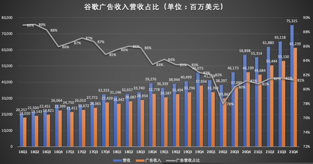 对比两家各项业务贡献的营收情况,微软三大业务版块各自为微软贡献了三分之一的收入,而Alphabet八成以上的收入来源于广告。最新财务数据显示,2021年Q4,谷歌广告营收612.39亿美元,为Alphabet贡献了81%的营收。