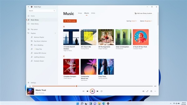 Media Player媒体播放器将采用全新的界面设计,和Windows 11的设计风格保持一致。此外它还包含全功能的音乐库,允许快速浏览和播放音乐,创建和管理播放列表等。它还支持丰富的艺术家图像、专辑封面,允许浏览、管理和观看本地视频等。