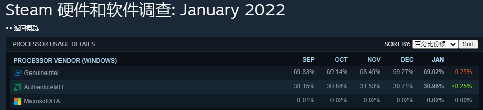 CPU 方面,份额最高的依然是 Intel 处理器,总占比 69.02%;不过 AMD 的份额依然在稳步增长,本月比 2021 年 12 月提高了 0.25%,目前总占比为 30.96%。