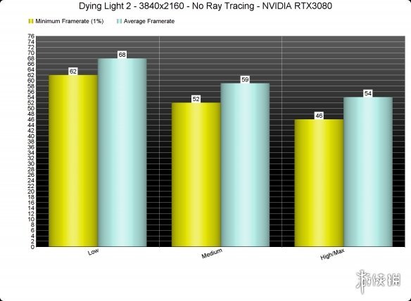 可惜的是,这款游戏通过画质设定来实现的显卡兼容性比较差。从图标中可以看出,RTX3080只能在最低画质下以原生4K分辨率跑到60fps。话又说回来,尽管使用最低画质,游戏的画面效果也不会太差。