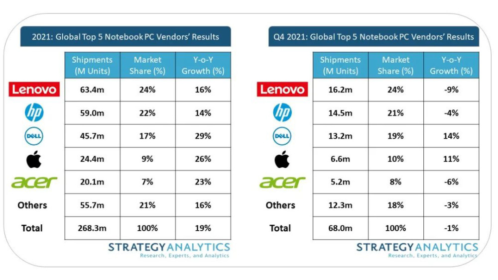 报告:2021年全球笔记本电脑出货量创纪录,联想、惠普、戴尔前三