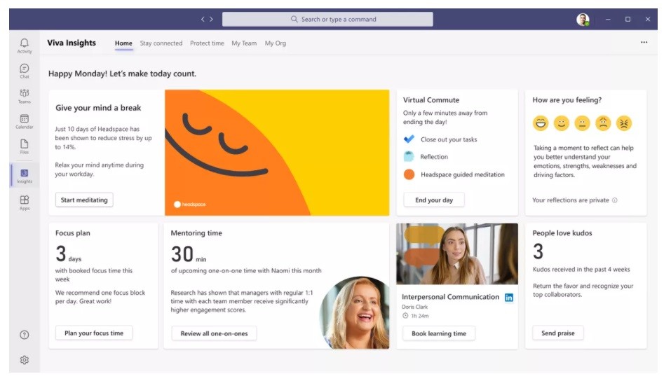 见解模块用于统计员工数据,管理人员可以从该模块收集员工的工作数据,对员工的生产力进行分析。微软也表示,该模块将尊重员工隐私,某些数据只能员工个人查看。