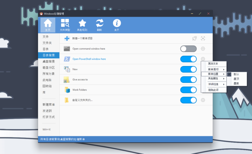 如下图所示,该应用将右键条目们按位置分门别类,从 Windows 徽标到某个具体文件类型,无所不包。具体到某个条目,我们能调整其图标、条目位置、命令等属性。