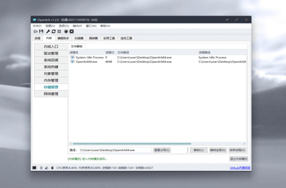 想要知道究竟是哪个应用占用了快捷键,可以打开 OpenArk,进入内核 > 系统热键界面,然后选择进入内核模式。