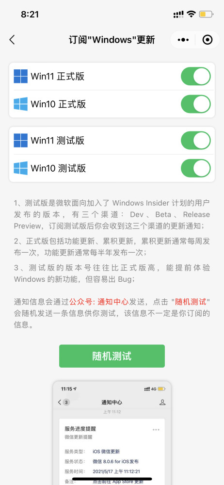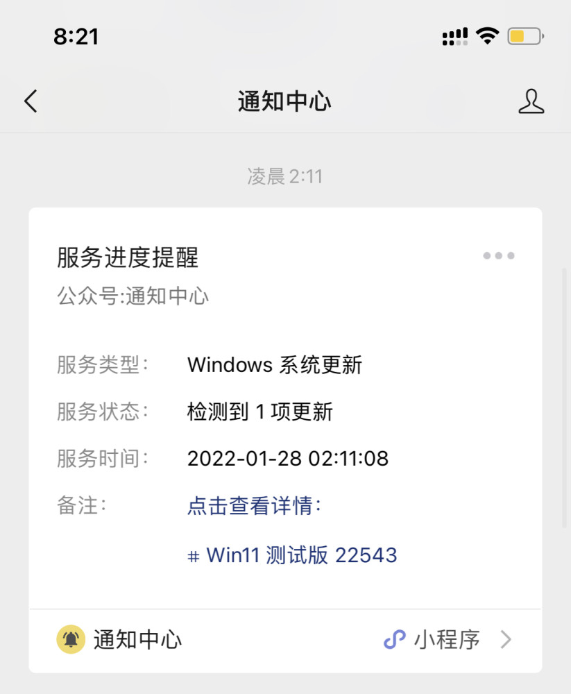 最后,如果你也希望能第一时间接收 Windows 11 的系统更新通知,可以在微信搜索“通知中心”并订阅相关选项: