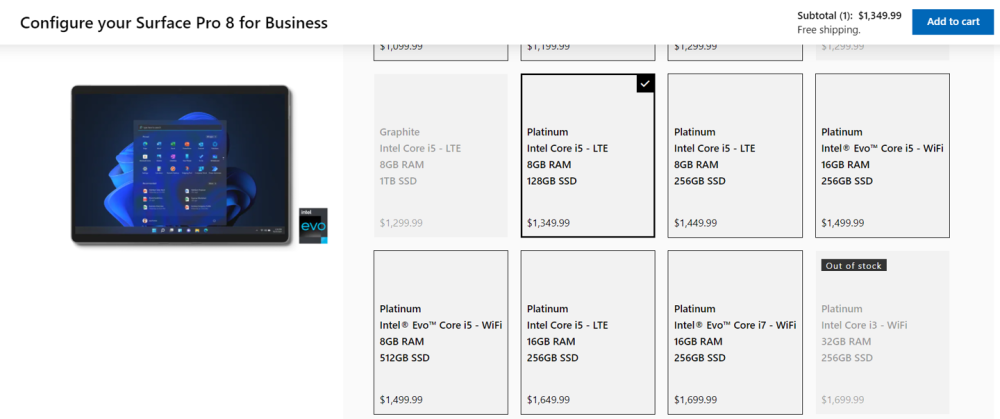 微软推出Surface Pro 8 4G LTE 版本, 支持4G LTE,1349美元起!