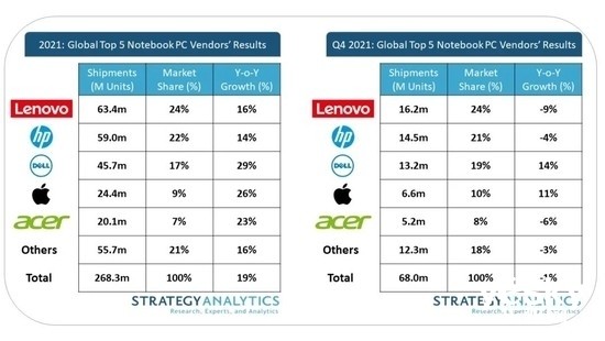 在厂商的细分方面,2021年第四季度,联想笔记本电脑出货量为1620万台,同比下降9%,环比增长6%;同期惠普保持第二的位置,笔记本电脑出货量达到1450万台,同比下降4%;戴尔笔记本电脑出货量达到创纪录的1320万台,同比增长14%,环比增长8%;苹果延续了之前的势头,在2021年第四季度创造了该公司历史,在假日季出货量超过660万,同比增长了11%;宏以520万台的笔记本电脑出货量重返前五名,与上一季度受供应问题的负面影响相比,环比增长6%。