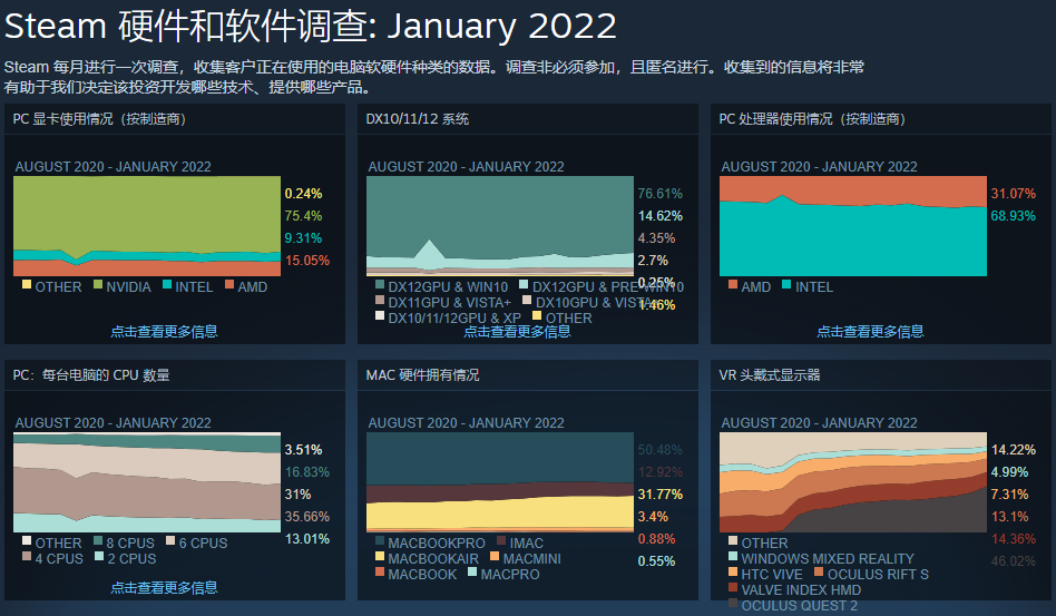 Steam此次针对了玩家的PC硬件、系统等内容进行了一次大规模调查。由于该调查属于非强制性调查,所以,数据仅以接受Steam调查用户的实际情况为准。以下是此次调查的几组主要数据: