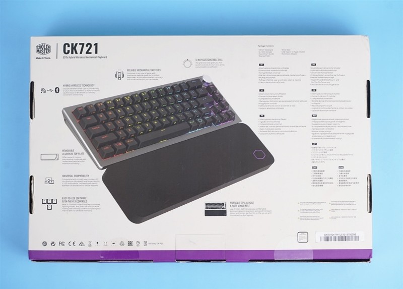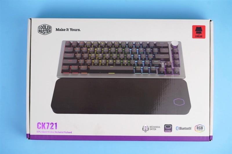 包装上使用了酷冷至尊的特色风格,并且从介绍就可以看出,酷冷至尊轴刃CK721为68键布局的红轴机械键盘,支持蓝牙连接和RGB灯效等特性。