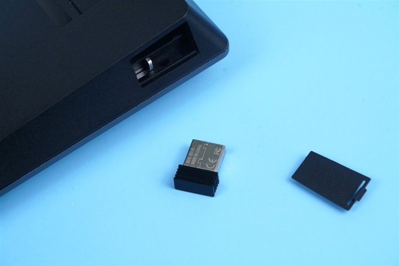 键盘左侧有一个可打开的仓口,里面放了2.4G无线适配器。