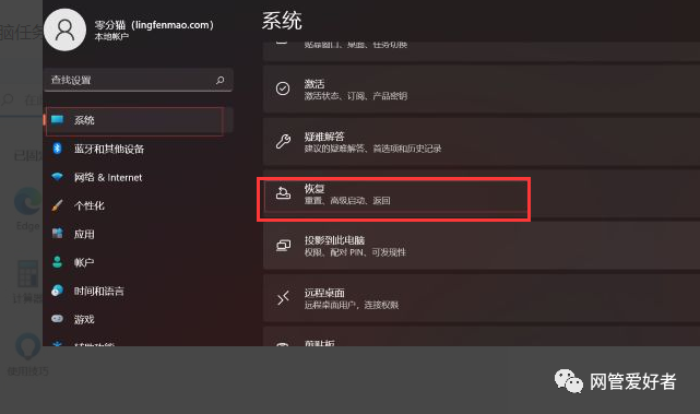 Windows11怎么恢复出厂设置,进入后在“系统”选项中找到“恢复”。