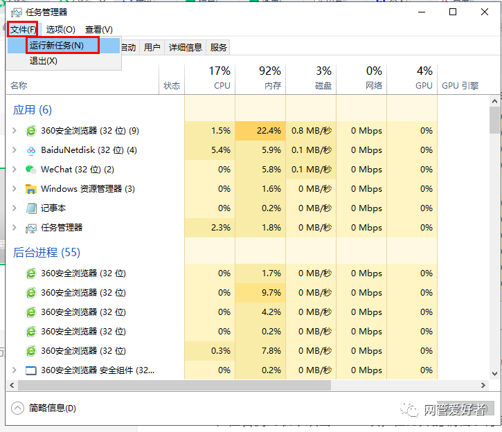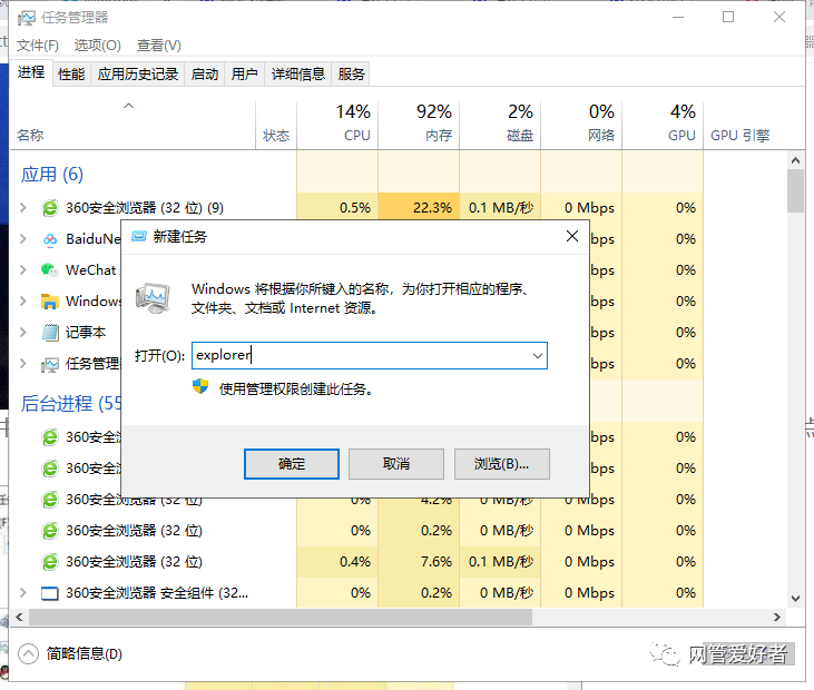 3、在打开的任务管理器中,点击“文件---运行新任务”选项,在弹出的“新建任务”窗口中输入“explorer”命令,后点击确定;