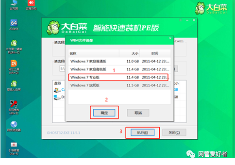 4、选择之前准备在U盘里面的ISO镜像安装。参考下图:选择“Windows 7 SP1 64位专业版。点击“确定”,再点击“执行”后会弹出大白菜一键还原的窗口